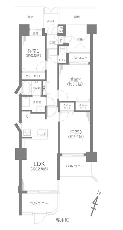 | 間取り/間取り詳細 | 3LDK / LDK12.8帖 / 洋室3.8帖 / 洋室5.3帖 / 洋室5.9帖 | ||